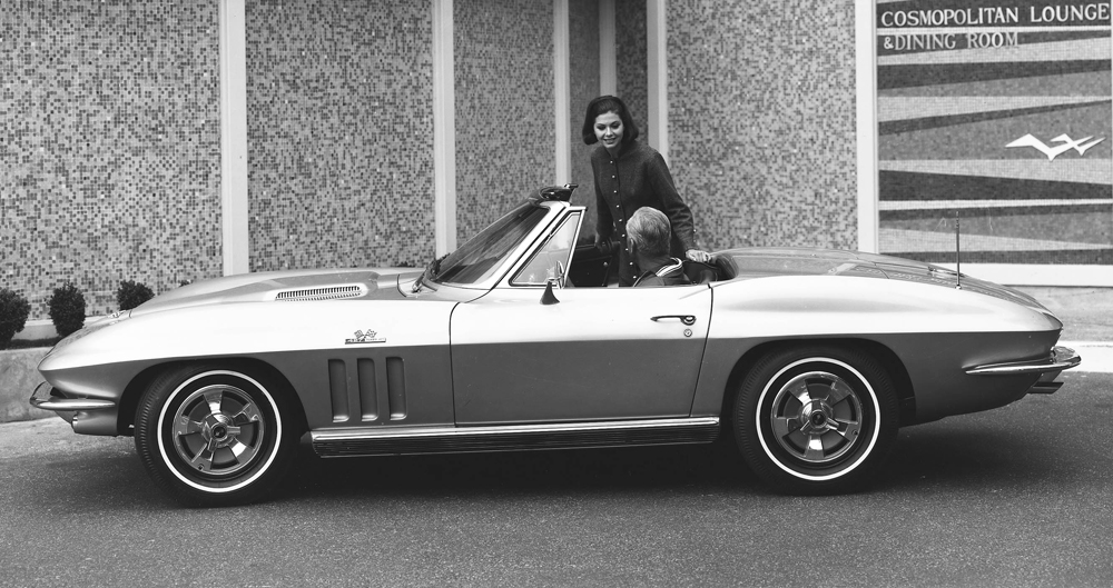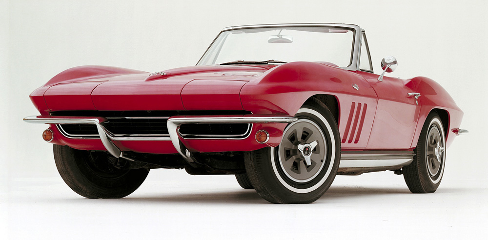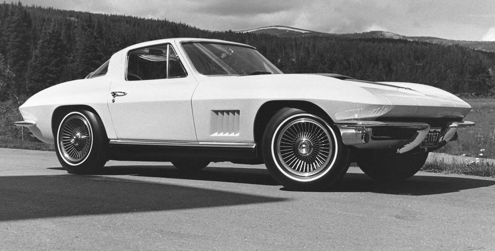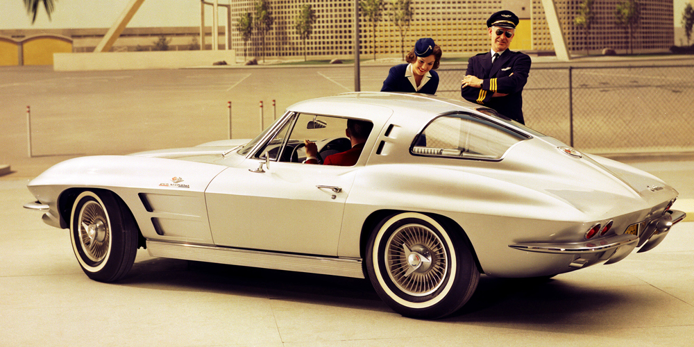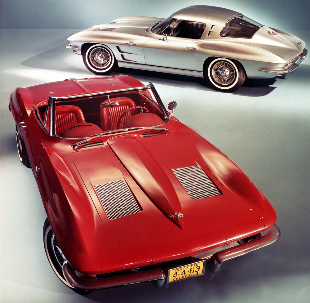 The American sports car departs from the European tradition with a total restyle based on Bill Mitchell’s 1959 Stingray race car. The new car has many firsts: Concealed, rollover headlamps; arched fenders; a streamlined appearance; two Corvette body styles, coupe and convertible; a full-independent rear suspension; and lightweight aluminum wheels. It is the only year for the split-window coupe.