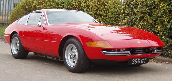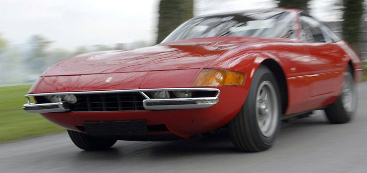 Early prototype examples featured a nose style based on that of the outgoing 275 GTB4 model, but the definitive style was a radically different and more angular wedge design, featuring a full width Plexiglass strip behind which were mounted a twin headlight assembly at each side, running into the wing sides with the side/turn indicator units. In 1971 this lighting arrangement was superseded by a twin retractable system, as changes in USA legislation did not permit headlights behind covers. As this model had been designed from the outset to comply with US legislation, due to the importance of sales in that market, the alteration had to be made. An alternative of fixed open headlights had been tried, but this upset the clean shape of the nose, whilst the retractable solution meant that the original profile would be retained, except when the lights were in use.
