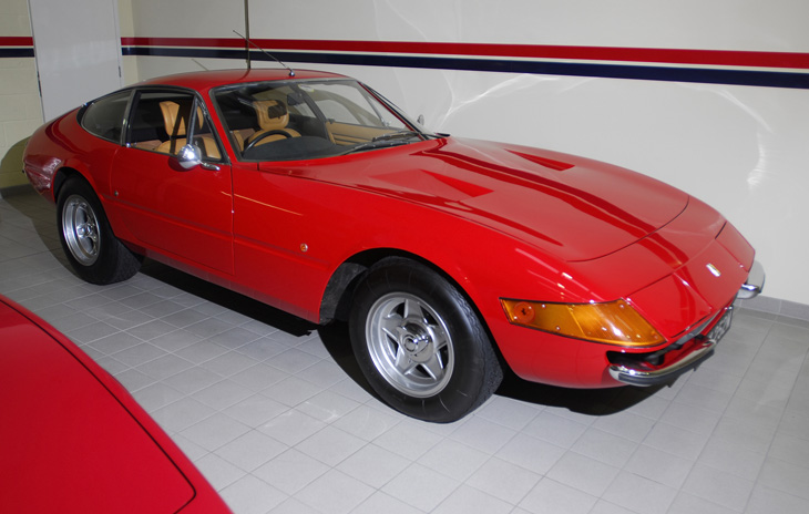 Apart from the standard road cars, there were three series of five client competition examples built at the factory’s “Assistenza Clienti” department in Modena, along with an earlier one-off all-aluminium bodied car for Luigi Chinetti’s North American Racing Team. The first series of five competition examples, built in 1971, had all aluminium bodies. They featured slightly flared wheelarches with wider wheels, aerodynamic “fences” on the front wings, a small chin spoiler, and a lack of quarter bumpers, as the main identifying features. The second series, produced in early 1972, had steel bodies with the aluminium bonnet, boot lid, and doors of the road cars, but with much increased flares to the wheelarches, to accommodate even wider wheels and tyres. The third series, produced in early 1973, were visually very similar to the series II cars, but had steel doors, with only the bonnet and boot lid in aluminium. They received carefully built and balanced engines to racing standards, and some performance details were enhanced by the homologation of special parts over the period of production.