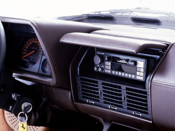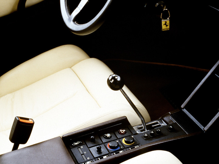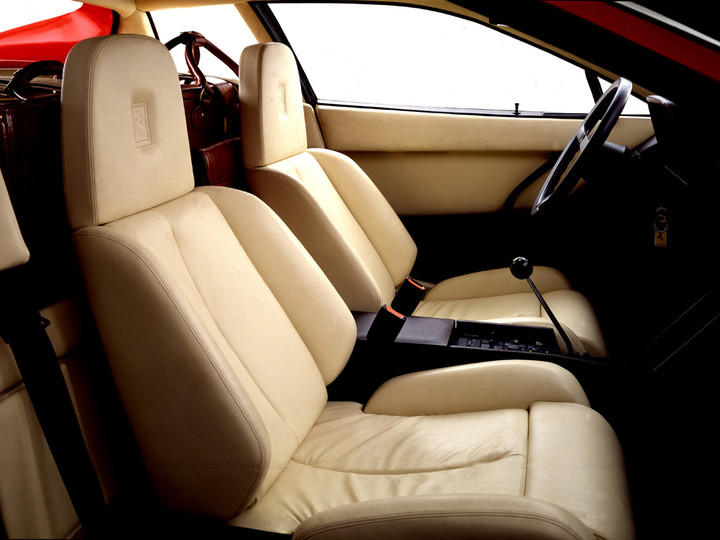 The Pininfarina designed replacement for the Boxer series was visually radically different from its predecessor, although it still featured a mid mounted flat twelve engine as its motive power. Gone was the sharp nosed wedge profile, to be replaced by a much softer rounded front end. The front wings flowed into one of the models most distinctive styling features, the deeply straked door panels that grew in width towards their trailing edge, before blending into very wide rear wings. At the rear, the paired circular tail light arrangement that had been a styling feature for over a decade was gone. In their place was a full width horizontally slatted satin black louvre hiding rectangular combination light units. The reason for the great rear girth and the body colour straked door louvres, was the twin side mounted water radiators which received their cooling air via the door intakes. The matt black egg crate “grille” in the nose of the car was a dummy to provide a link with Ferrari tradition, bordered by combination driving, side, turn indicator light assemblies, with paired headlights in retractable pods on the upper face of the nose. The repositioning of the radiators provided the benefit of additional luggage space in the nose, useable luggage space being something that had been a shortcoming of the Boxer series. Although the front track was only 12mm greater than that of the 512 BBi, the rear track increased by a massive 105mm, making the car wedge shape in plan rather than in profile.
