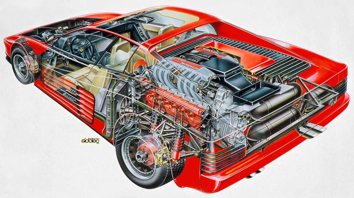 The engine was the first four valves per cylinder flat twelve cylinder configuration unit fitted in a Ferrari road car, but maintained the same cubic capacity of 4943cc, and 82mm x 78mm bore and stroke, of the 512 BBi model, and had factory type reference number F 113 A 000. It had twin belt driven overhead camshafts per bank, now driven directly off the crankshaft instead of via idler gears on the earlier Boxer models. The dry sump engine was longitudinally mounted in unit with the five speed transmission, in a very similar manner to that of the preceding Boxer series. It was fitted with a Marelli Microplex MED 120 B electronic ignition system and Bosch KE-Jetronic fuel injection, to produce a claimed 390bhp @ 6300rpm for European models, and 380bhp @ 5750rpm for US market models.