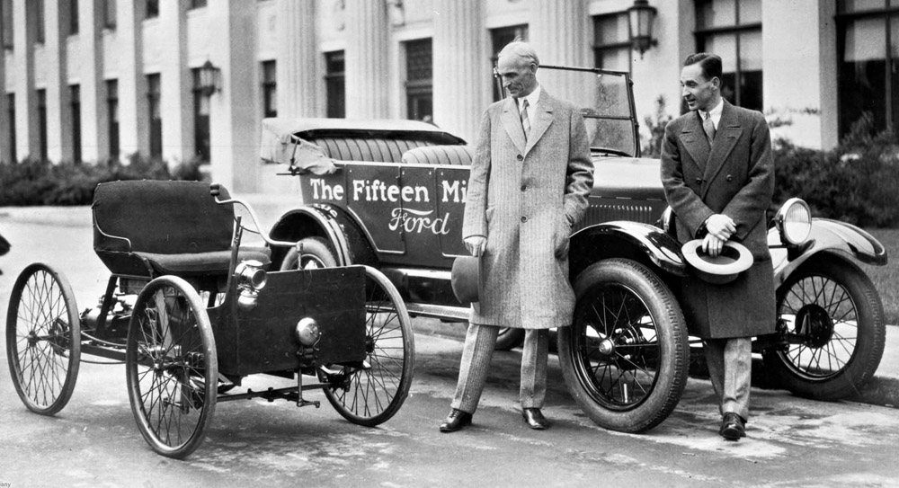 Henry Ford with the 1896 Quadracycle and the 10 millionth Ford vehicle the Model T.