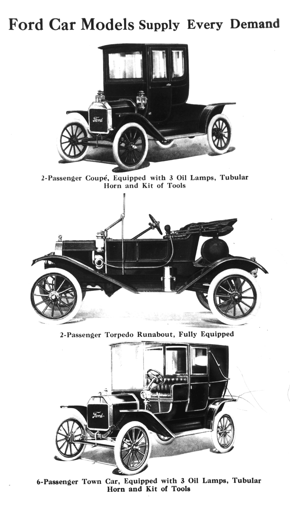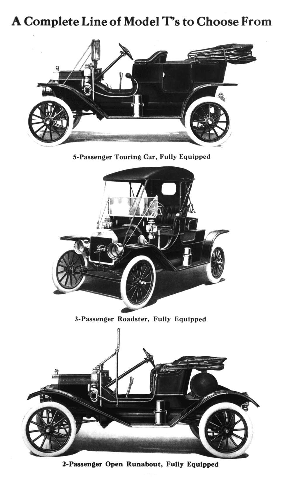 1911 Model T line-up ad: 1911 proved to be a stellar year for the Model T. Sales were way up and the cost of the vehicle was coming down. Ford was now the undisputed major car producer in the United States. From the collections of The Henry Ford and Ford Motor Company.