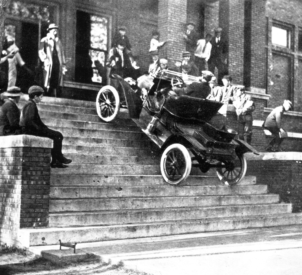 1911 Model T runabout driving up steps of YMCA Columbus, Nebraska: The Model T’s fame is is often associated with durability, strength, and endurance. From the collections of The Henry Ford and Ford Motor Company. (04/21/08)