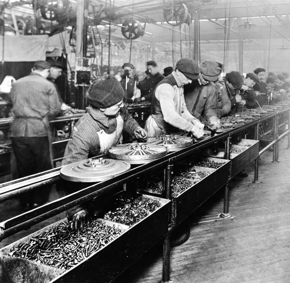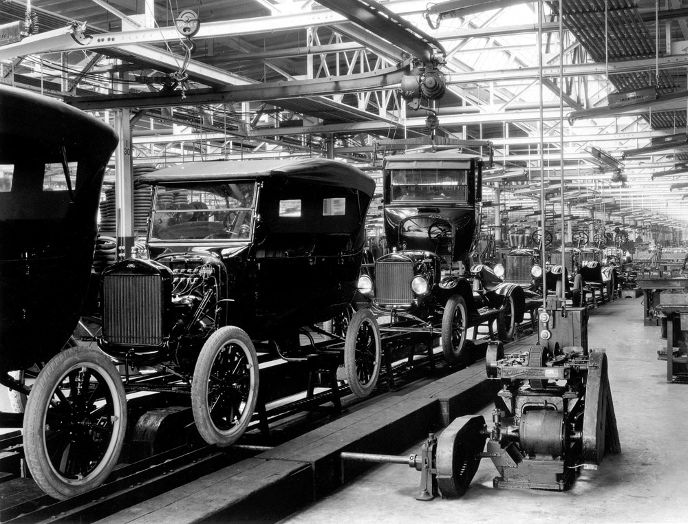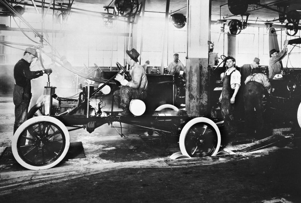 The moving assembly line became operational at the Highland Park Plant in 1913. Thanks to this and many other innovations, the time it took to build a Model T dropped from up to 14 hours to about 1.5 hours. From the collections of The Henry Ford and Ford Motor Company. (4/22/08)