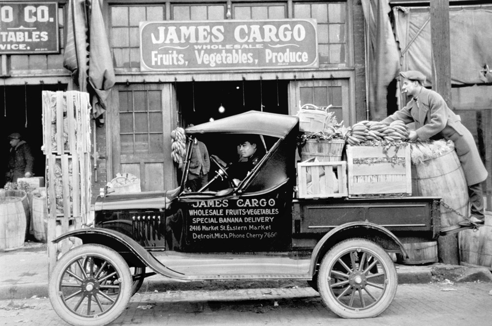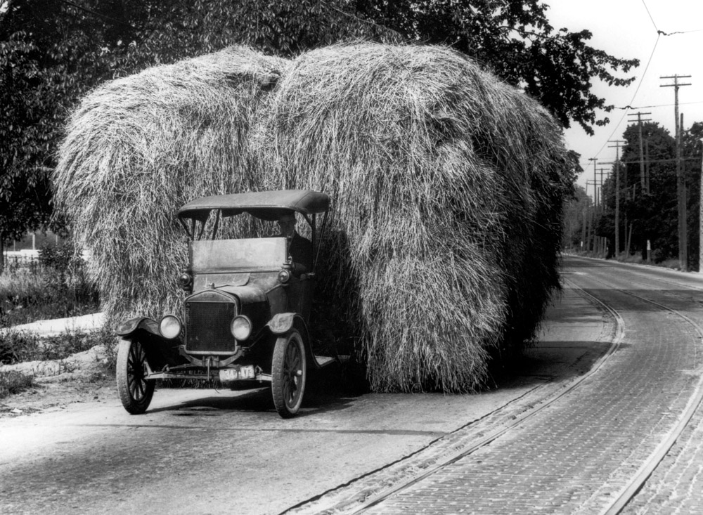 The Model TT (truck) was first sold in 1908. Although no verified hauling specifications are known, this one is pictured loaded with 8,000 pounds of hay. It was probably driving well below the Model Ts top speed of 40 mph.