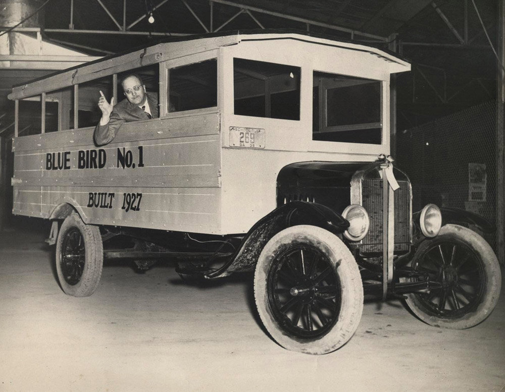 In 1927, Albert Luce (seen here) put a steel body on a Ford Model T chassis to make the first steel-bodied school bus. Luce, who once owned a Ford dealership, went on to found the multi-million dollar Blue Bird Body Company, building steel-bodies busses that significantly outlasted the wood-bodied variety. (07/21/2008)