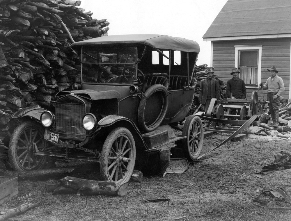 Model T adapted to saw boards: Model T’s were known for their modificationcapability and tradesmenused its versatility for a variety of applications. One of the most popular uses was pulling power off the engine to run small portable saw mills. From the collections of The Henry Ford and Ford Motor Company. (4/22/08)
