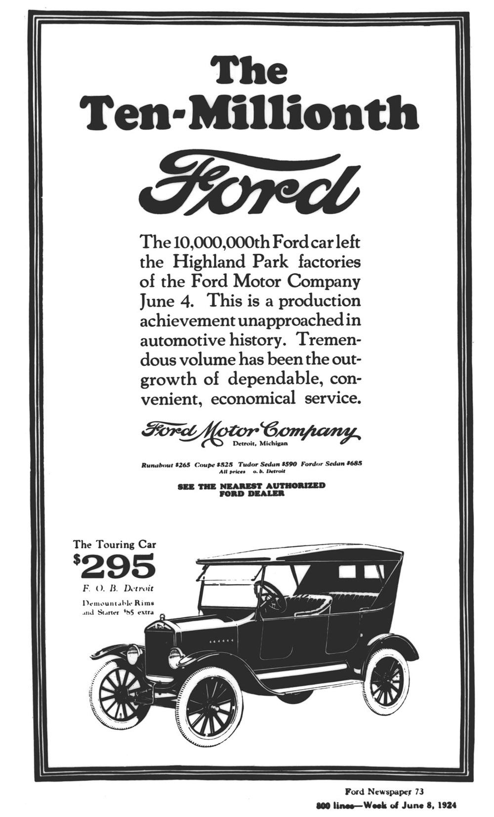 June 1924. Ten Millionth Model T come off the line: The 10 millionth Model T was produced on June 4; famed Ford racing driver Frank Kulick drove it from New York to San Francisco on the Lincoln Highway, the only coast-to-coast highway at the time. From the collections of The Henry Ford and Ford Motor Company. (04/21/08)