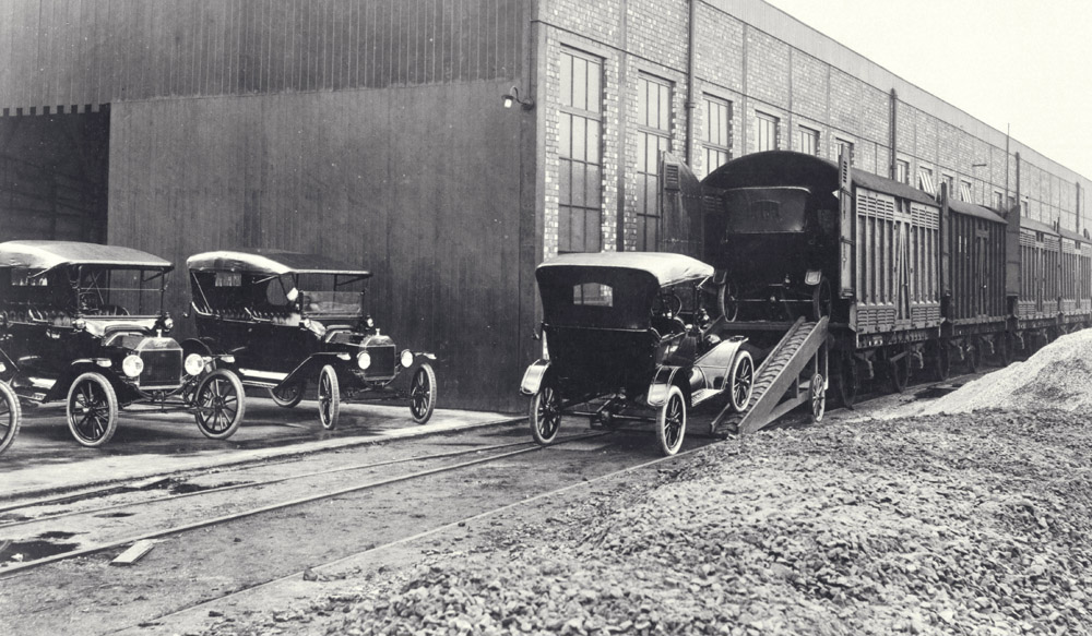 Model T’s being loaded on railcars in 1910: Ninety percent of the completed Model T’s were shipped within 24 hours, because no storage was available at Highland Park. A completed Model T was loaded on special auto carrying railcars and sent to destinations all over the United States and ultimately the world. From the collections of The Henry Ford and Ford Motor Company. (04/21/08)