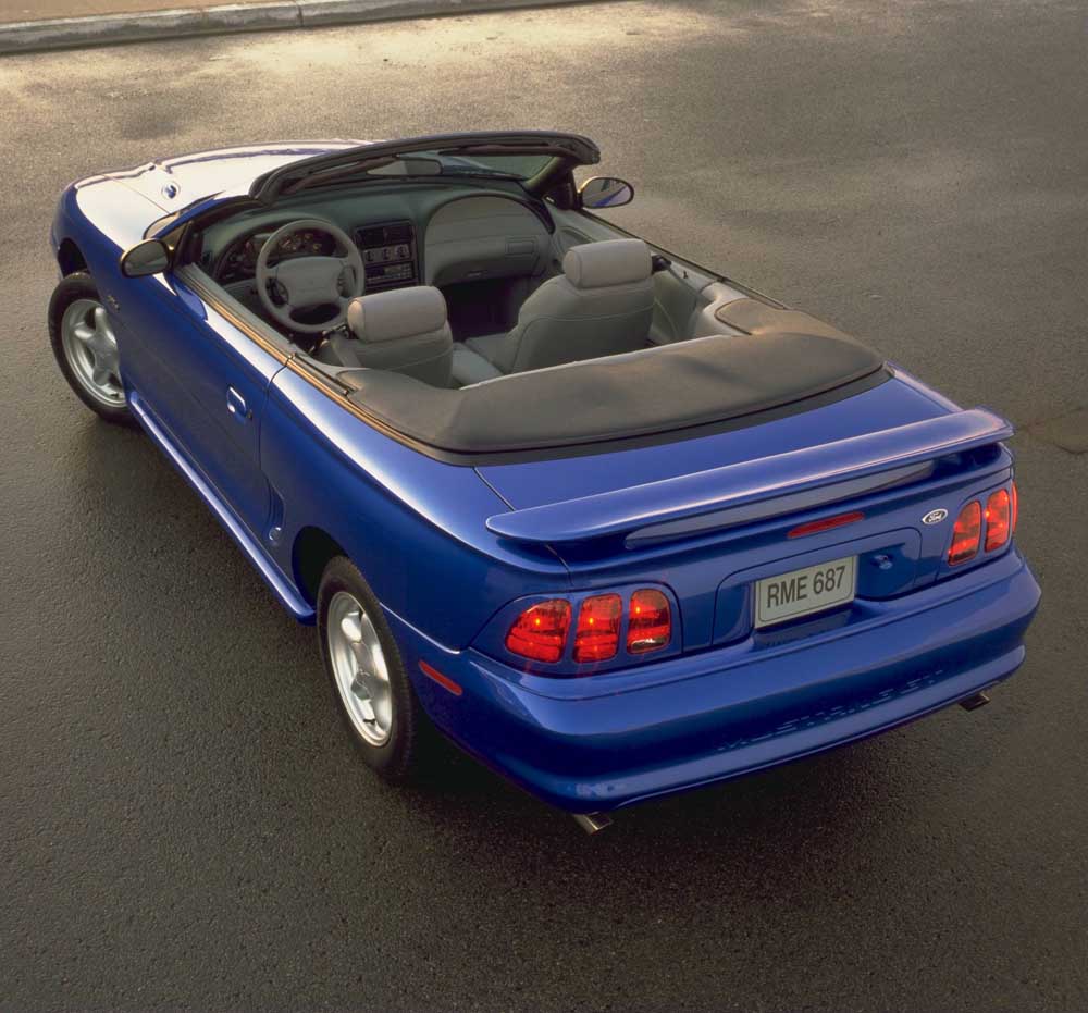 1996: Mustang GTs and SVT Mustang Cobras are for the first time equipped with Ford’s 4.6-liter modular V-8 engine, which uses overhead cams to open the intake and exhaust valves. The Cobra’s 4.6-liter dual-overhead cam (DOHC) aluminum V-8 produces 305 hp.