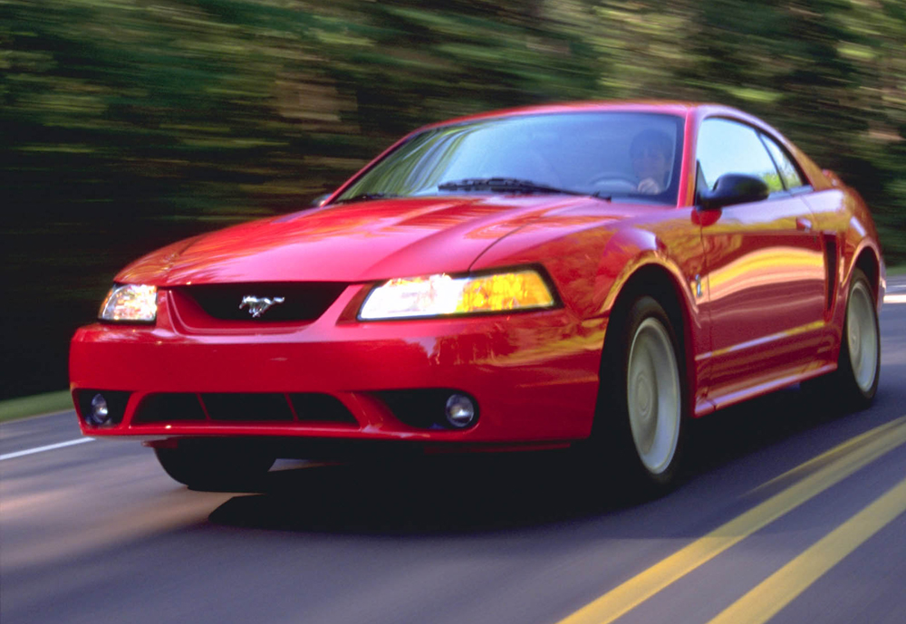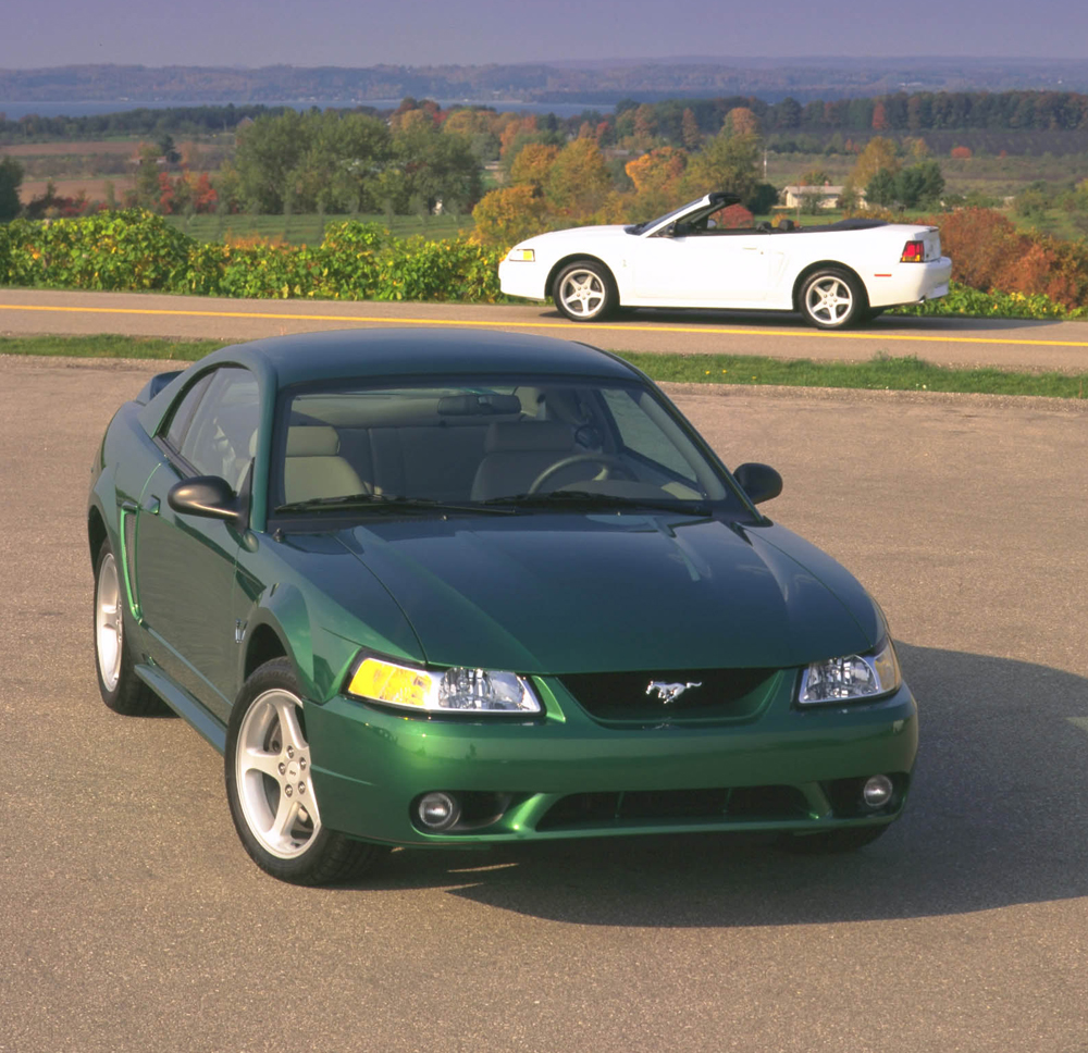 1999: A redesign gives Mustang sharply creased lines and pronounced wheel arch flares, plus a new hood, grille, fascias and lamps. The base 3.8-liter V-6 gets a 27 percent increase in horsepower, to 190 hp, and comes with 35th Anniversary badging. The SVT Mustang Cobra becomes the first Mustang with a fully independent rear suspension. The car’s 4.6-liter DOHC V-8 now produces 320 hp.