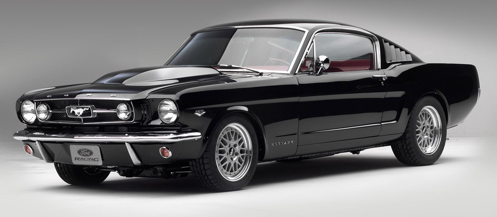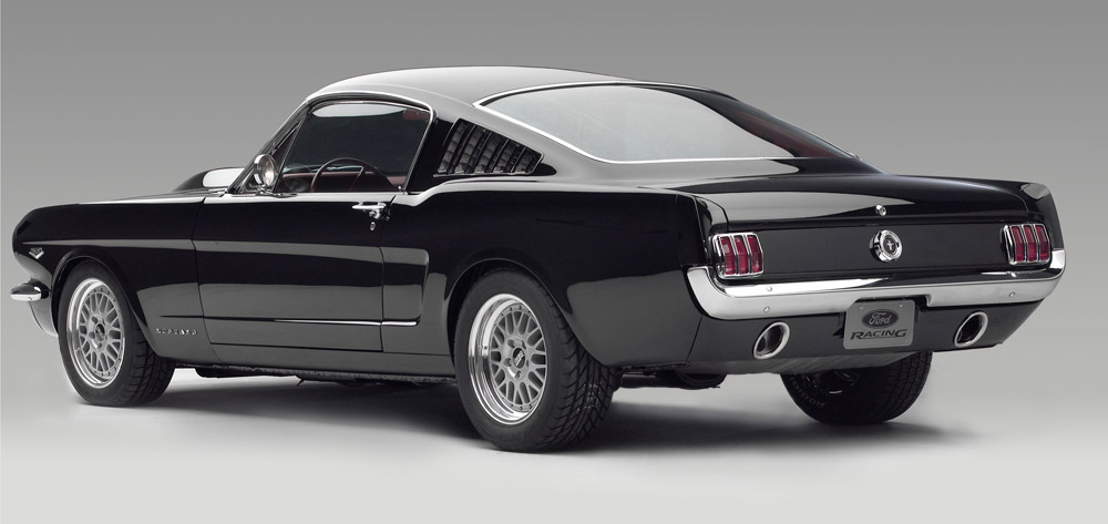 Showcasing the latest factory technology with a retro twist, Ford Racing Performance Parts 1965 Mustang Fastback features the new all-aluminum 5.0L DOHC “Cammer” V8 crate engine fed with four 2-barrel Weber carbureters.