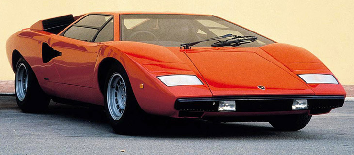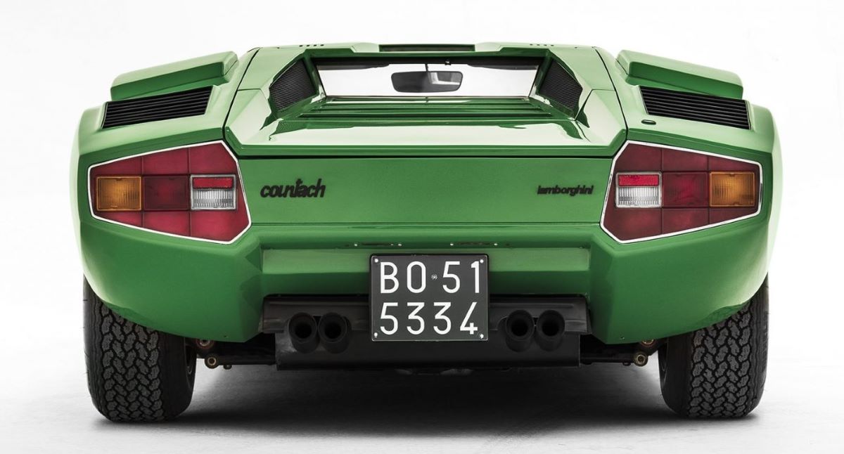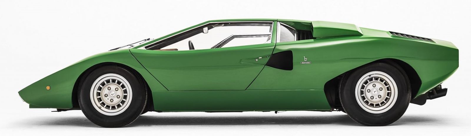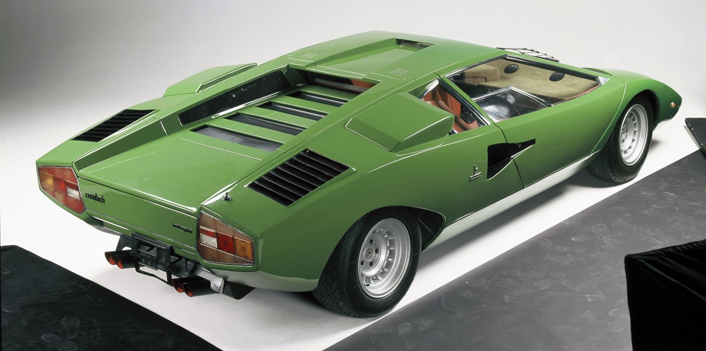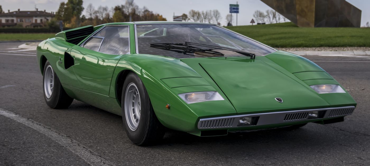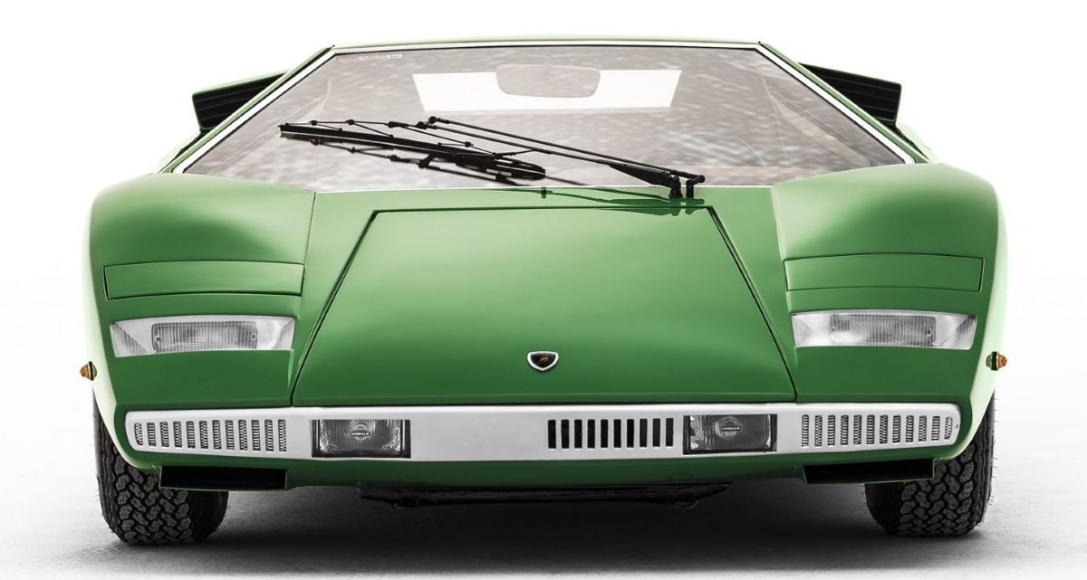Standard production of the Countach began at the end of 1973 with the bright-green model exhibited at the Paris Motor Show, which is now part of the permanent collection of the Lamborghini Museum. This was the first Countach featuring the large single front windscreen wiper.