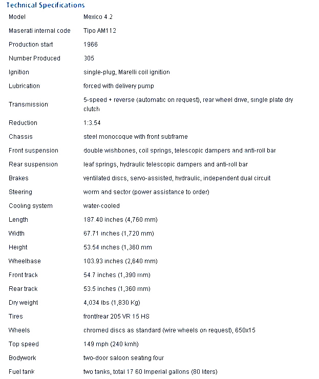 Launched in 1966 at the Paris motor show, the production Mexico was offered with the same engine variants as the Quattroporte, either a 4.2 or a 4.7 liter version (the same engine sizes offered in the modern GranTurismo and Quattroporte). The chassis itself was derived from the Quattroporte II, with a wheelbase shortened by 11 cm.