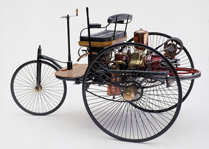 Carl Benz applied for a patent for his Motor Car on 29 January 1886. The German Patent No. 37435 is considered the birth certificate of the automobile. It bears the heading: “Vehicle with gas engine operation”, and the text begins with the words: “The present design serves for the operation of mainly light vehicles and small boats, such as those used for the conveyance of one to four people. For whichever system, power is provided by a small gasoline engine. This is fed with fuel from an apparatus carried on board, in which gasoline derived from ligroin or other volatile substances is produced. The engine’s cylinder is maintained at a constant temperature by the evaporation of water.” A French patent was applied for on 25 March the same year.