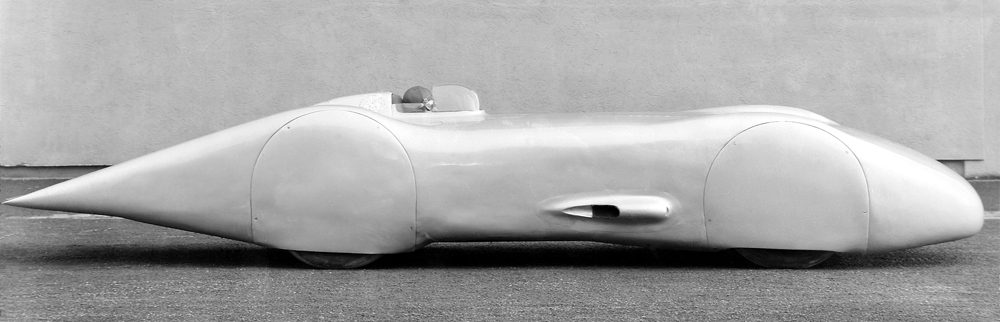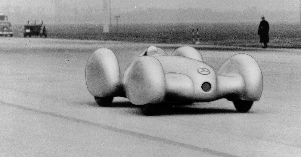 The record-breaking car of 1936 was also based on the chassis of the W 25 but here, for the first time, was fitted with a fully streamlined body that also enclosed the wheels and the underbody. Developed in the wind tunnel of the Zeppelin works at Friedrichshafen, the light-alloy construction weighed around 100 kilograms, so allowing it to achieve the sensational drag coefficient, or cd value, of 0.235. Power came courtesy of a V12 engine (MD 25 DAB/1) with an output of 616 hp (453 kW) from a displacement of 5577 cc. This had originally been designed for use in Grand Prix racing, but proved to be too heavy. With this engine, Caracciola was able to set several records for a Class B vehicle, for example with a world record of 333.5 km/h over 10 miles from a standing start. The top speed achieved over this distance was 372 km/h.