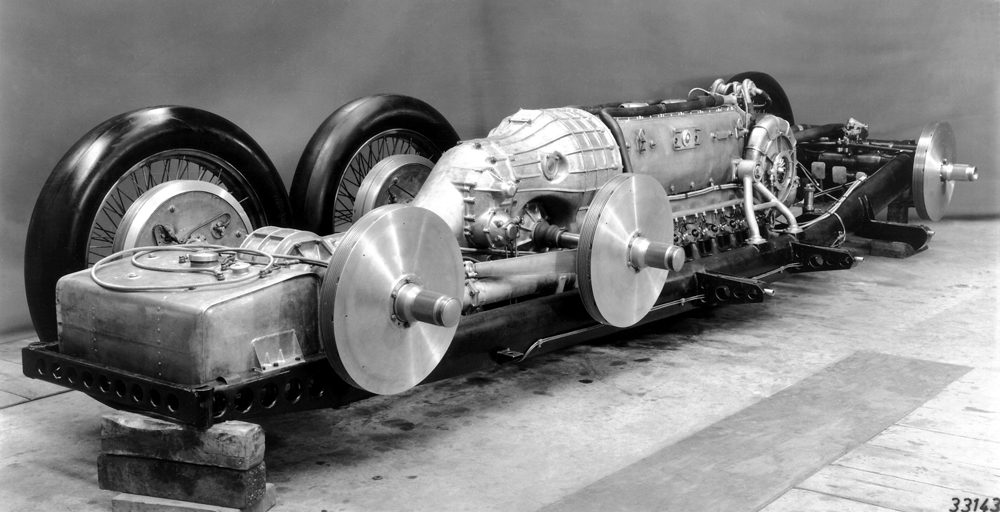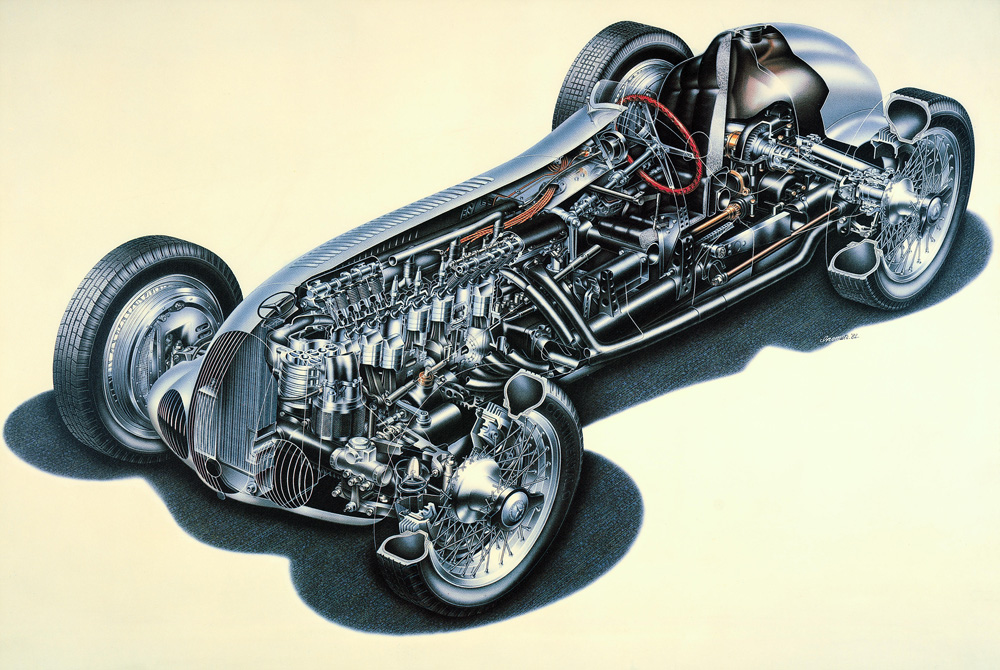There was certainly no shortage of ideas from the racing design engineers: they considered the idea of a W 24 naturally aspirated engine with three banks of eight cylinders each, as also of a rear-positioned engine, direct petrol injection and a fully streamlined body. In the end, primarily in order to manage the thermal conditions, the engineers opted for a V12 with a V-angle of 60 degrees, developed in-house by Daimler-Benz specialist engineer Albert Heess. The cylinders were combined in groups of three in welded-on steel plate cooling jackets with non-removable heads. Powerful pumps propelled 100 litres of oil per minute through the engine, which weighed around 260 kilograms. Compression was provided initially by two single-stage superchargers, which were replaced in 1939 with a single two-stage unit.