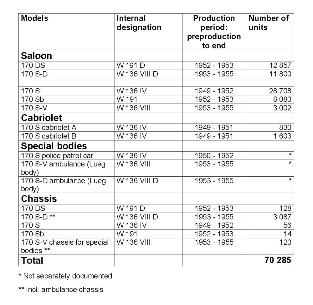 The 170 S-V and 170 S-D models of 1953 marked the final development stage. They came onto the market at almost the same time as the more modern 120 series with three-box body, and combined the largely unchanged chassis of the 170 V and 170 D models with the more spacious body of the 170 Sb and 170 DS models. The lack of chrome strips on the louvres of the bonnet, bumpers without horns, and simplified interior appointments distinguished the weaker-powered models externally from the 191 series. The 170 S-V model was built until February 1955; production of the more successful 170 S-D model did not cease until September of that year.