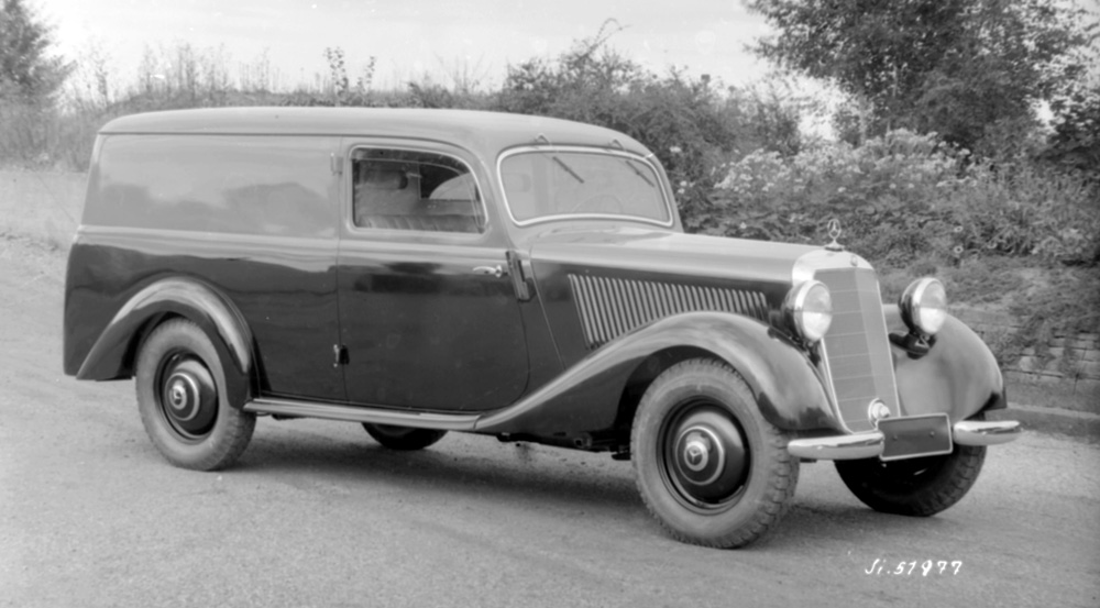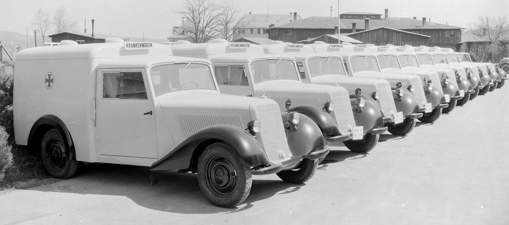 The model series was superseded by the three-box body “Ponton” (W 120) in 1953, although production was not discontinued until 1955. In the representational car segment, on the other hand, the 300 model (W 186 II) made its debut in 1951, along with the Mercedes-Benz 220 (W 187) prestige class saloon. The different versions of the delivery vehicle also profited from the start of production of the saloon in 1947. They now came with a modified cab, the structure and equipment of which met saloon standards. At the turn of the year 1949, the design engineers also adapted the ambulance concept to meet raised demands. The ambulance was given a more spacious, modernised body, which was built in Bochum by the Lueg company.