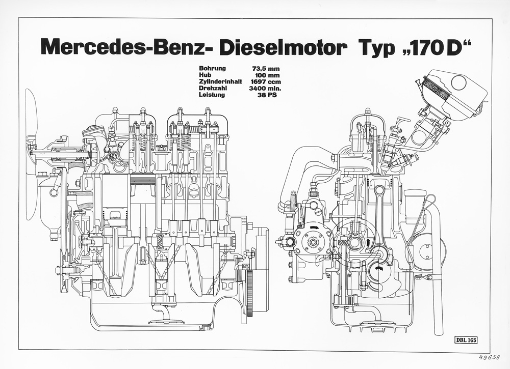 At the Technical Export Fair in Hanover in May 1949, Daimler-Benz introduced the first Mercedes-Benz car models featuring new post-war designs: the diesel model 170 D and the prestigious 170 S saloon derived from the 170 V model. To a large extent the 170 D corresponded to the 170 V model, but it had a 1.7-litre diesel engine, which the Stuttgart engineers developed from the petrol engine of the 170 V model. The prechamber engine developed 28 kW (38 hp), like the petrol engine. The 170 D model was the first Mercedes-Benz diesel car of the post-war period, and as heir to the pioneering diesel-powered Mercedes-Benz 260 D (W 138) of 1936 it laid the cornerstone for the ongoing success of this drive variant in Mercedes-Benz passenger cars. Compared with its petrol-powered twin, the 170 D model consumed appreciably less fuel – yet had almost identical performance. It provided the platform on which was built the good reputation of the company’s diesel cars, renowned for their longevity and economy. In addition, in the 170 D model’s early production years the ready supply of diesel oil made this model an attractive proposition, whereas even five years after the war petrol was sometimes still hard to find.