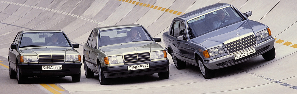 The W 124 adopted elements of this young, sporty, compact automobile, but set standards all its own for design and engineering. There were parallels to the compact class, for instance, in the use of high-strength sheet steel and other weight-reducing materials. Despite lightweight design, the Mercedes engineers further improved vehicle safety, with the W 201 and W 126 S-Class serving as benchmarks. The passenger compartment of the 124 series excelled with high side-impact and rollover resistance and was provided with well thought-out de`formation zones at front and rear ends. The criterion of the asymmetric frontal impact with 40 percent overlap at 55 km/h was now also met by the intermediate range. In addition, potential contact zones were designed to yield on impact for the protection of pedestrians and cyclists.