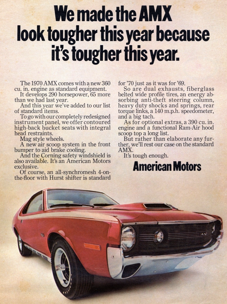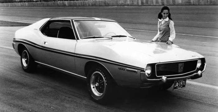 The 1971 Javelin/AMX was the newest and most sophisticated Javelin of all. With front and rear body “spoilers” roof spoiler, special T-stripe paint trim, plus the optional 401 cubic inch V-8 engine and custom interior.
